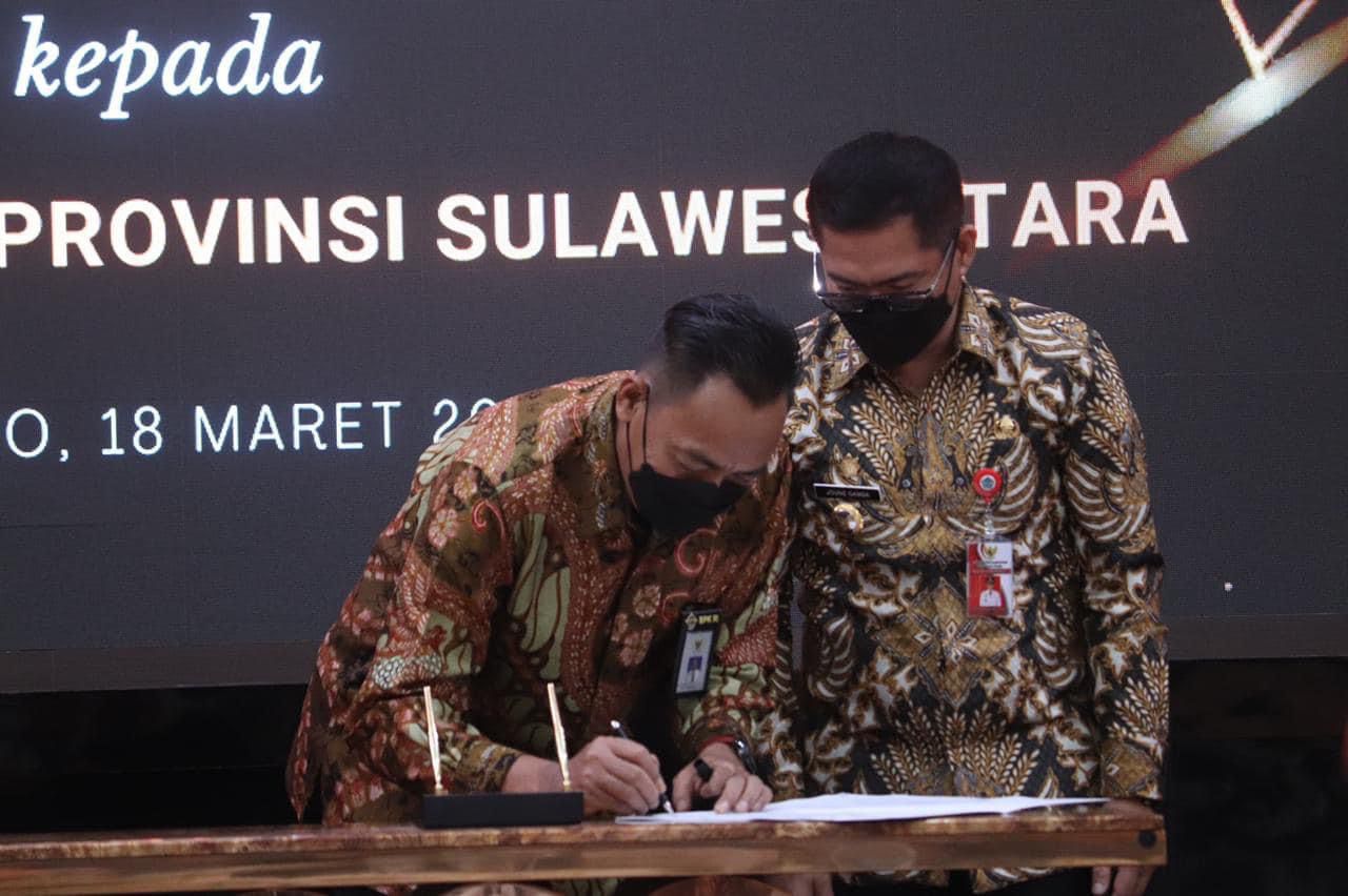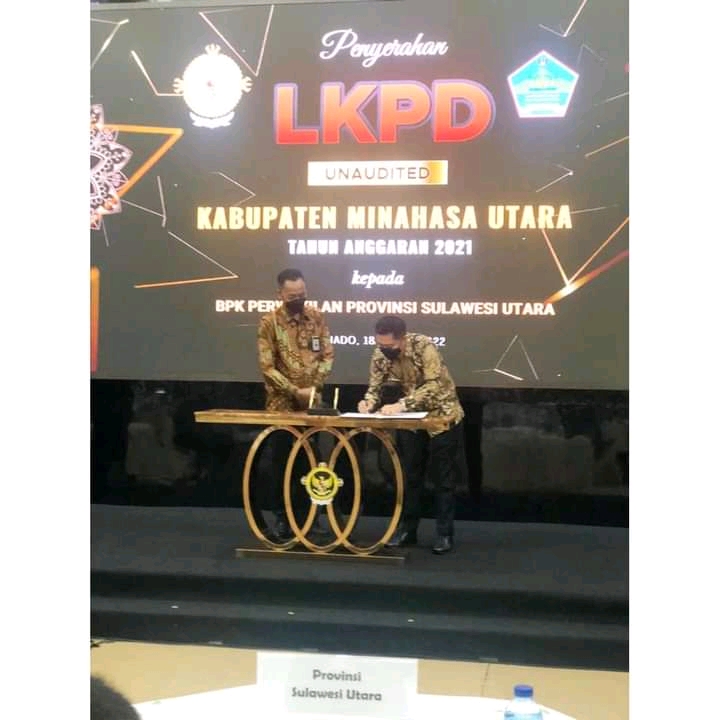 NEW POSKOMANADO MINUT — Bupati Minahasa Utara Joune Ganda dan Wakil Bupati Kevin Lotulung menyerahkan Laporan Keuangan Pemerintah Daerah (LKPD) Tahun Anggaran 2021 di kantor BPK RI Perwakilan Sulawesi Utara (Sulut), Jumat (18/3).