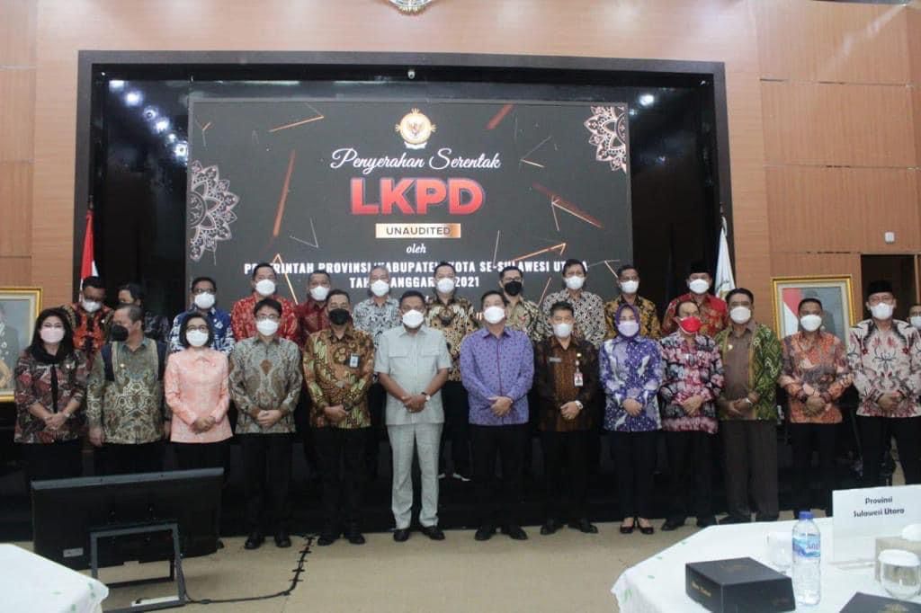 Penyerahan LKPD Tahun Anggaran 2021 ini berlangsung serentak oleh Pemerintah Provinsi Sulut serta pemerintah kabupaten/kota se-Sulawesi Utara kepada BPK Perwakilan Sulut.