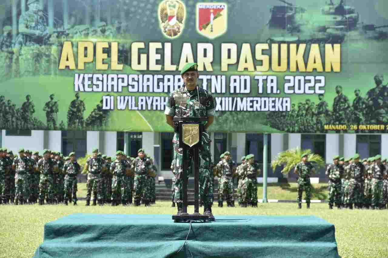 Pangdam XIII/Mdk Mayjen TNI Denny Tuejeh melaporkan kepada Kasad Jenderal TNI Dudung Abdurachman, sebanyak 3.585 prajurit Kodam XIII/Medeka yang terbagi menjadi Tiga titik yaitu Makodam XIII/Merdeka, Korem 133/Nani Wartabone Gorontalo dan Korem 132/Tadulako Sulawesi Tengah telah mengikuti apel.
