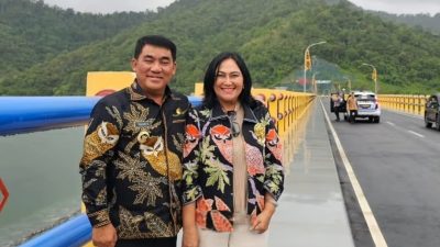 Kemudian atlet Sulut Pingkan Mandagi juga melakukan penerjunan dengan membawa bendera Provinsi Sulawesi Utara.