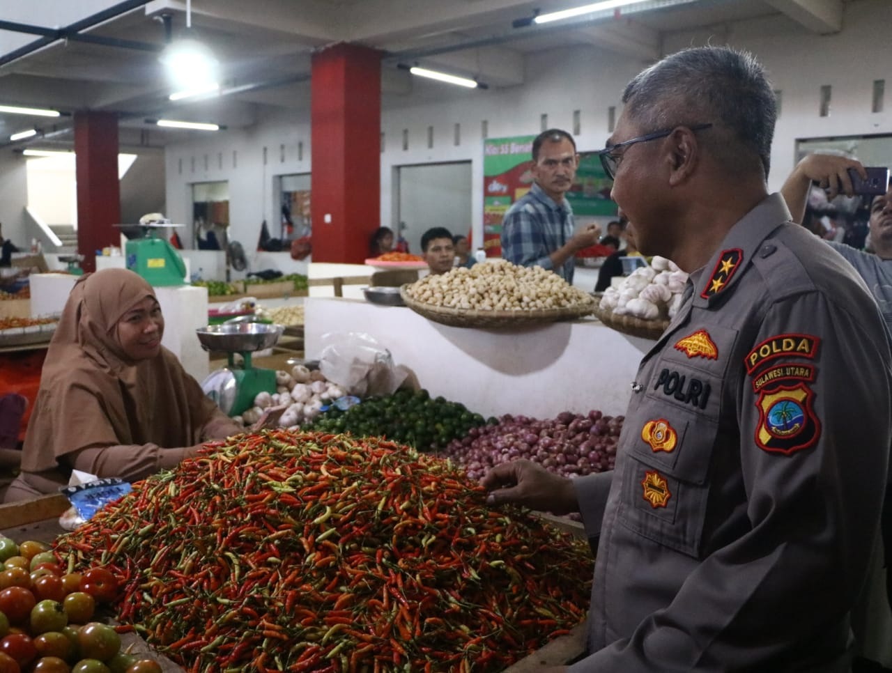 Selanjutnya, Kapolda didampingi Direktur Binmas, Kabid Humas, Kapolresta Manado, dan Kepala PD Pasar Manado, menyambangi para pedagang di Pasar Bersehati dengan berjalan kaki untuk mengecek ketersediaan maupun harga bahan pangan.