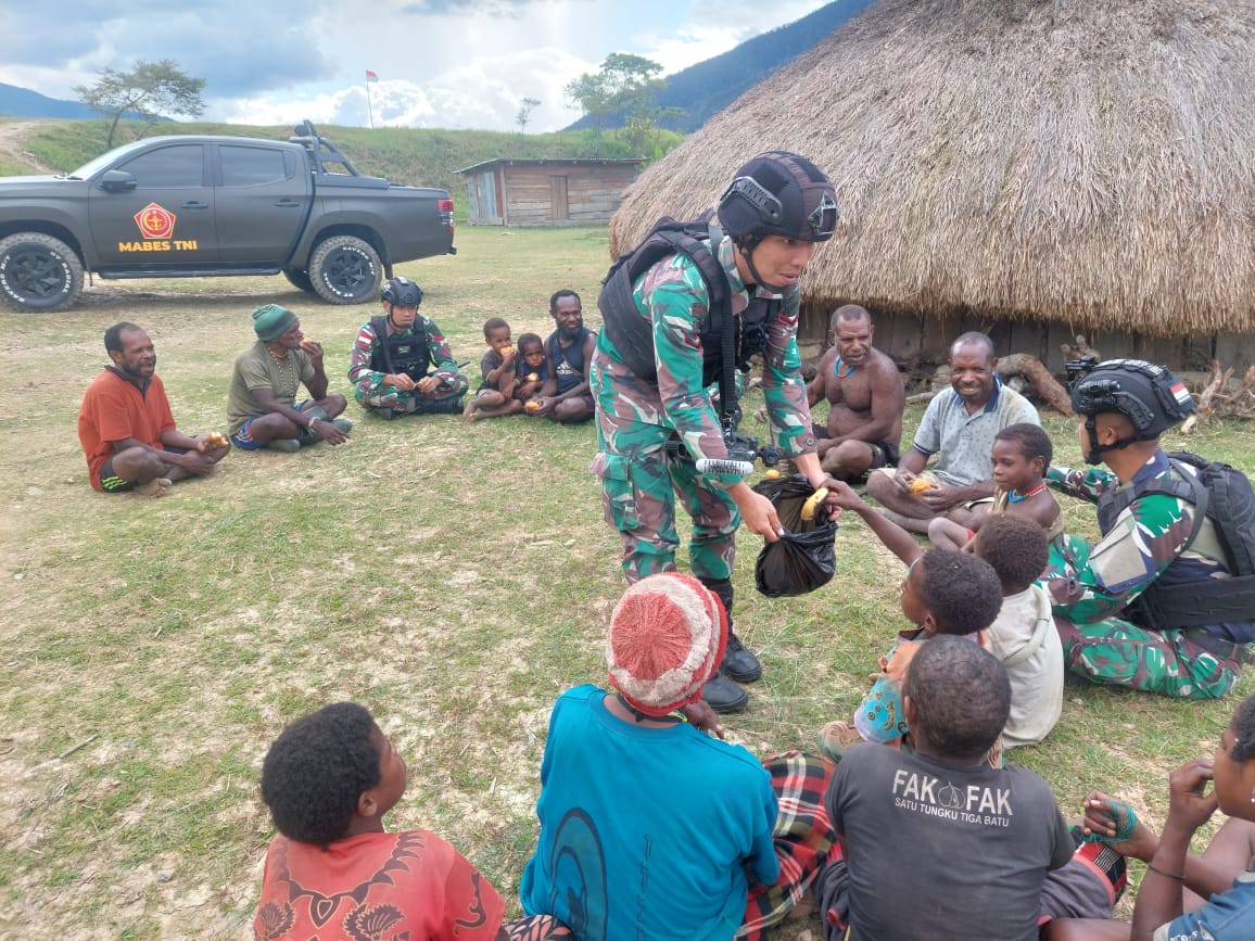 Sambil berbincang dengan keluarga Bapak Emi Tabuni dan warga setempat, satgas memberikan bendera merah putih sebagai bentuk kepedulian untuk menumbuhkan rasa cinta tanah air kepada masyarakat.