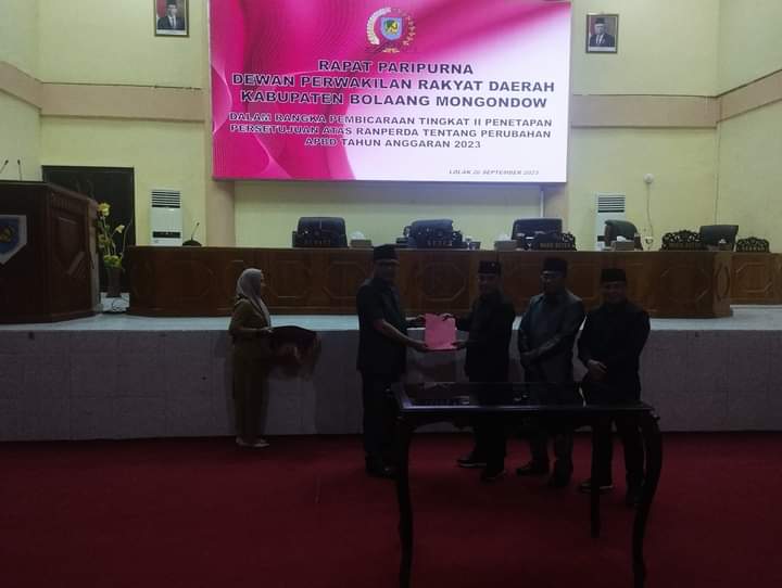 Dilanjutkan dengan penandatanganan persetujuan bersama atas Ranperda tentang perubahan APBD tahun 2023, dalam hal ini pimpinan DPRD dan Bupati Bolmong, Limi Mokodompit.