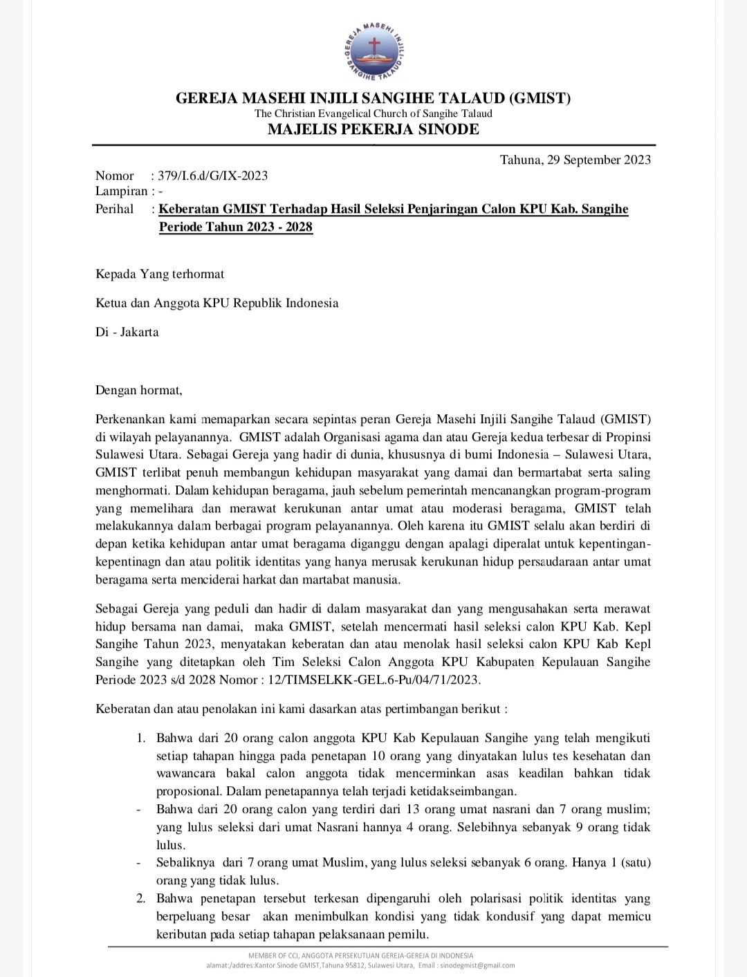 GMIST mencermati hasil seleksi calon KPU Kab. Kepl Sangihe Tahun 2023 dengan menyatakan keberatan dan atau menolak hasil seleksi Periode 2023 sampai 2028.