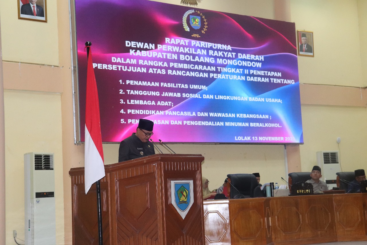 Ketua DPRD Bolmong, Welty Komaling dalam penyampaiannya mengatakan, 5 Ranperda inisiatif DPRD Bolmong itu yakni, Penamaan Fasilitas Umum, TanggungJawab Sosial dan Lingkungan Badan Usaha, Lembaga Adat, Pendidikan Pancasila dan Wawasan Kebangsaan dan, Pengawasan dan Pengendalian Minuman Beralkohol.