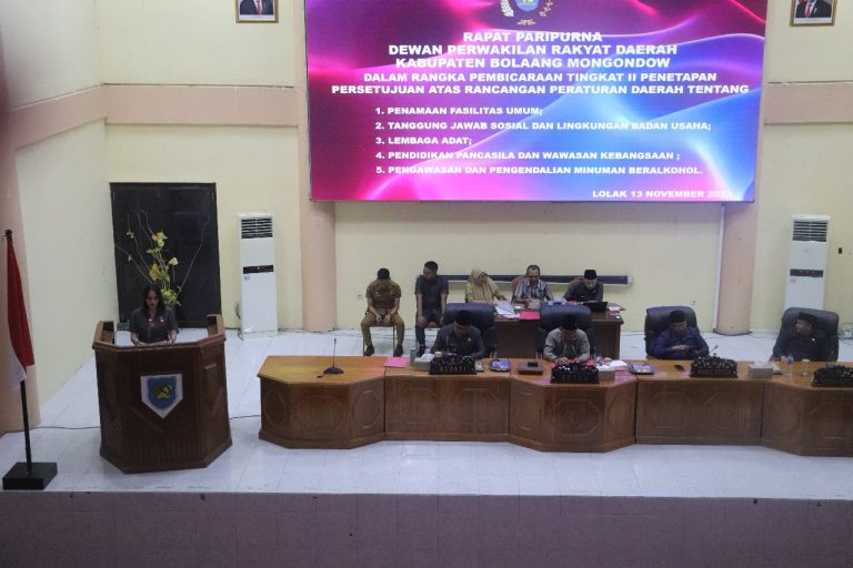 NPM, BOLSEL– Dewan Perwakilan Rakyat Daerah (DPRD) Kabupaten Bolaang Mongondow (Bolmong) menggelar rapat paripurna pembicaraan tingkat II penetapan persetujuan atas Rancangan Peraturan Daerah (Ranperda) inisiatif DPRD, Senin 13 November 2023.