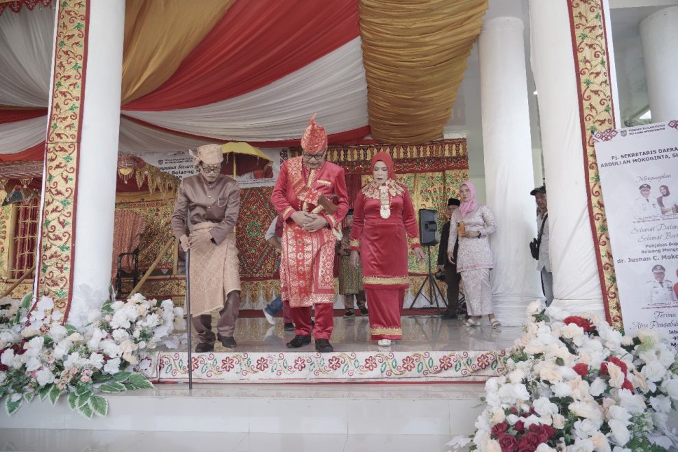 NPM, BOLMONG– Pasca dilantik Gubernur Sulawesi Utara (Sulut) Olly Dondokambey, Penjabat Bupati Kabupaten Bolaang Mongondow (Bolmong) Jusnan C Mokoginta, disambut atau dijemput secara adat di rumah dinas (rudis), Kecamatan Lolak, Rabu 29 Mei 2024.