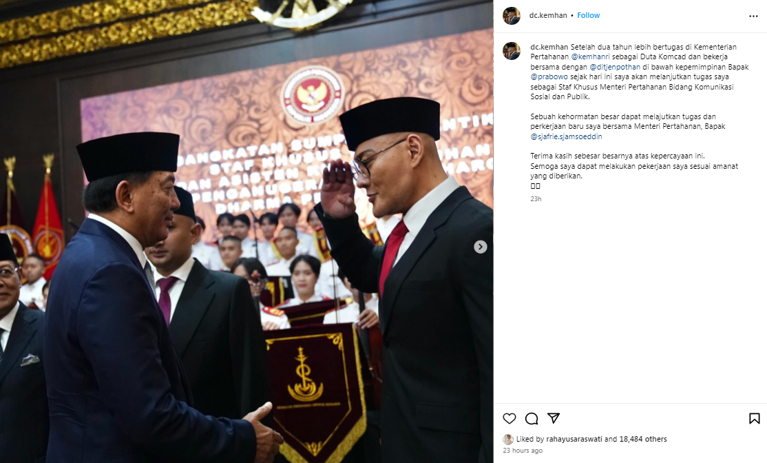 “Setelah dua tahun lebih bertugas di Kementerian Pertahanan @kemhanri sebagai Duta Komcad dan bekerja bersama dengan @ditjenpothan di bawah kepemimpinan Bapak @prabowo sejak hari ini saya akan melanjutkan tugas saya sebagai Staf Khusus Menteri Pertahanan Bidang Komunikasi Sosial dan Publik,” tulis Deddy Corbuzier.