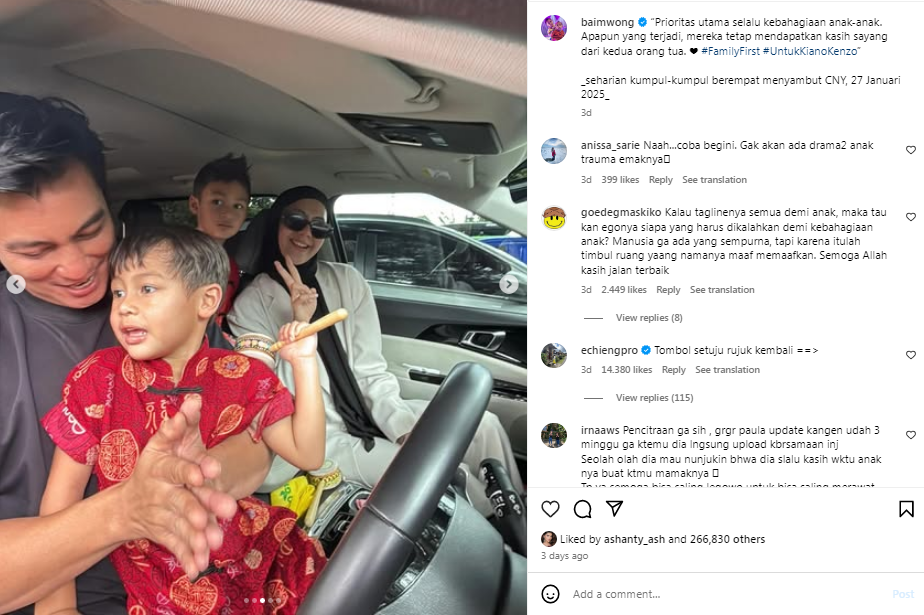 “Prioritas utama selalu kebahagiaan anak-anak. Apapun yang terjadi, mereka tetap mendapatkan kasih sayang dari kedua orang tua.  #FamilyFirst #UntukKianoKenzo _seharian kumpul-kumpul berempat menyambut CNY, 27 Januari 2025_,” tulis Baim Wong.