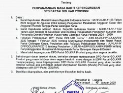 Itupun tertuang dalam Surat Dewan Pimpinan Pusat Partai Golkar, Surat Edaran bernomor : SE/DPP/GOLKAR/1/2025 Tentang : PERPANJANGAN MASA BAKTI KEPENGURUSAN DPD PARTAI GOLKAR PROVINSI.