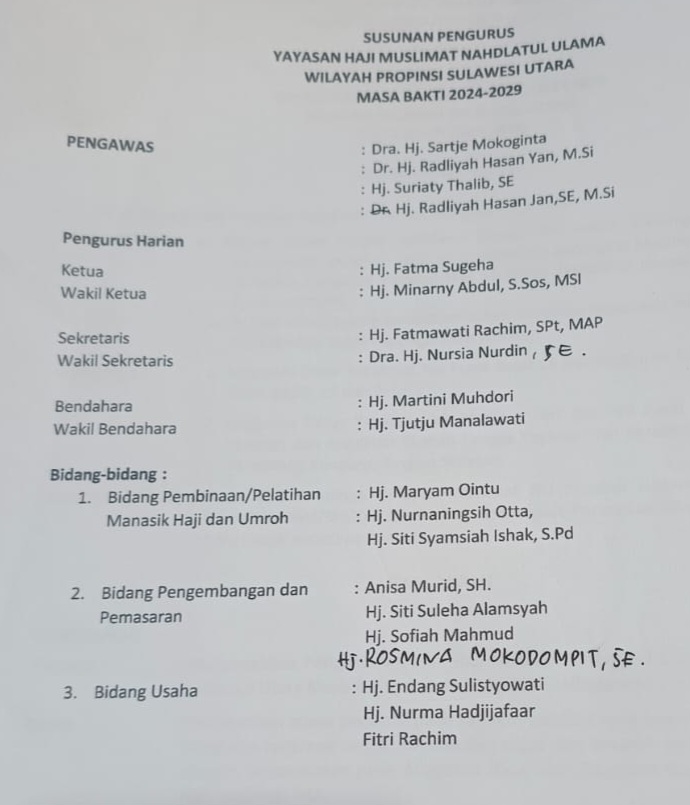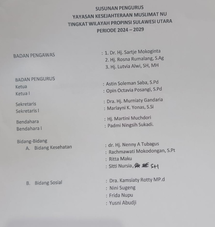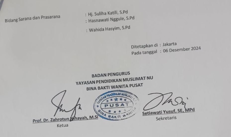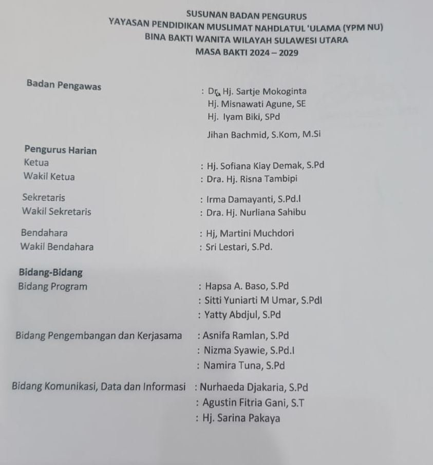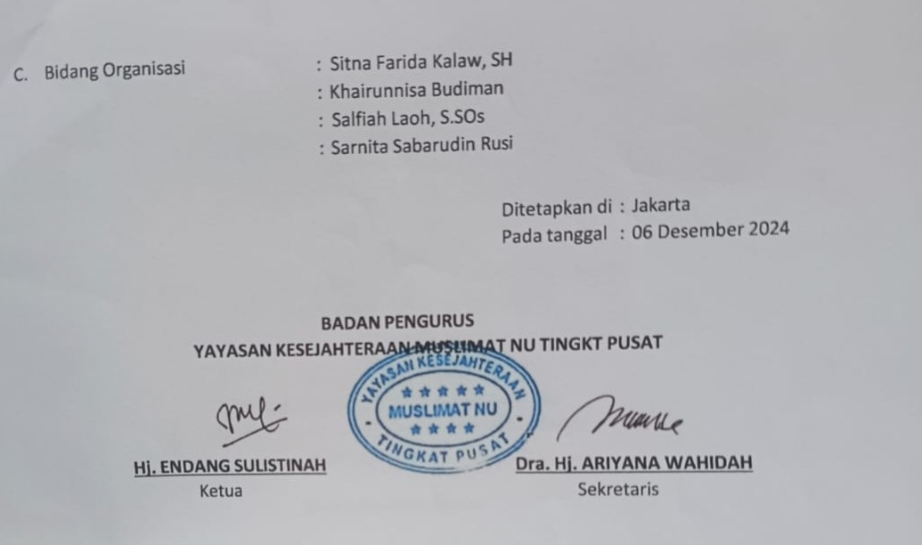 Berikut susunan pengurus perangkat Muslimat NU yang dilantik