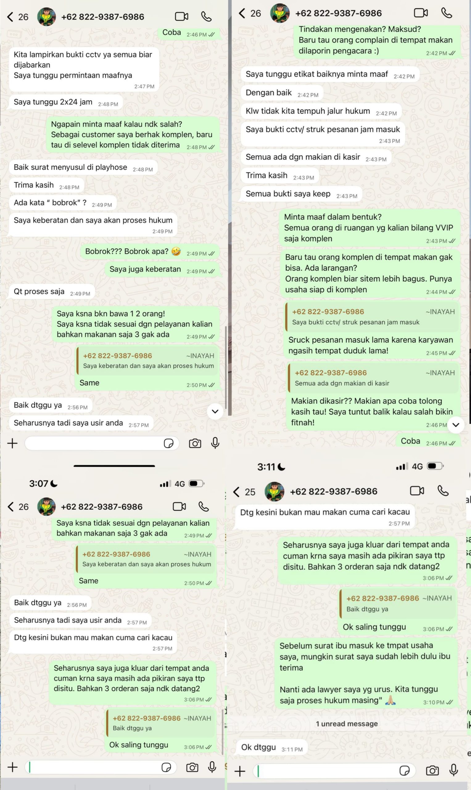 “Sebelum order sedari awal telah saya informasikan bahwa kami hanya ada waktu 2 jam menunggu dikarenakan ada kegiatan tournament billiard yang sedang kami adakan di tempat usaha saya. Kemudian pesanan yang sudah kami pesan sebelumnya juga masih menunggu lama, tiba-tiba waiters datang dan bilang ke kami “ayam masih mo ungkep dan memakan waktu sekitaran 45 menit untuk menunggu”, padahal sebelumnya waiters sendiri yang menyampaikan bahwa persiapan hanya memakan waktu 15 menit, karena tamu yang sudah reservasi diutamakan lebih dahulu tetapi tidak seperti yang disampaikan dan dijanjikan oleh waiters tersebut, dimana dari janji 15 menit malah menjadi 45 menit. Karena pernyataan dari waiters tersebut, maka kami mengganti menu dari ayam menjadi menu udang & cumi karena menurut waiters hanya itu yang sudah ready. Kami mengira sudah dipastikan menu diganti menjadi udang karena katanya ayam belum diungkep, namun waiters malah balik lagi dan mengatakan ayam sudah ready sehingga kami meminta untuk dibacakan kembali pesanan agar tidak double order. Selanjutnya setelah makan, kami meminta bill dan langsung membayar di kasir, saat dikasir sama sekali kasir tidak menyampaikan adanya total tagihan sebesar Rp.270.000,- yang tidak dibayarkan oleh kami, pun owner tidak menyampaikan hal itu melalui whatsapp,” ujarnya.