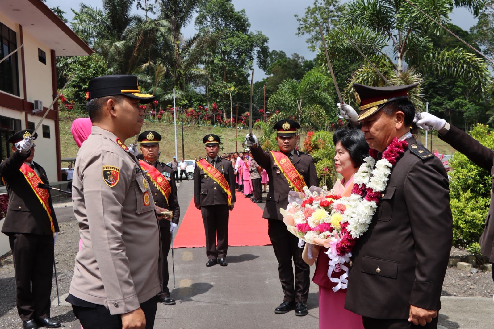 Upacara Tradisi Pedang Pora Wisuda Purna Bhakti, Kapolres bersama pejabat utama dan seluruh personel memberikan penghormatan, ucapan terima kasih serta doa terbaik kepada purnawirawan Kompol Sammy Pandelaki atas pengabdian selama bertugas di kepolisian.