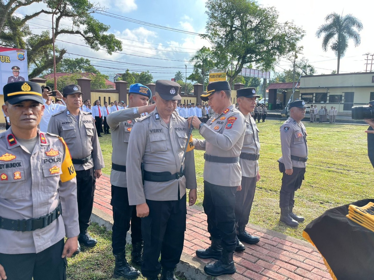 Pada kesempatan tersebut, Kapolres Kotamobagu secara simbolis memasangkan ban lengan Pamapta kepada perwakilan Pamapta I, II, dan III, yang dirangkaikan dengan penyerahan peralatan komunikasi Handy Talky (HT) serta satu unit kendaraan roda empat (R4) Pamapta sebagai bentuk dukungan operasional sekaligus menandai dimulainya langkah awal penyesuaian struktur organisasi guna memperkuat peran dan fungsi Samapta dalam pelaksanaan tugas kepolisian..