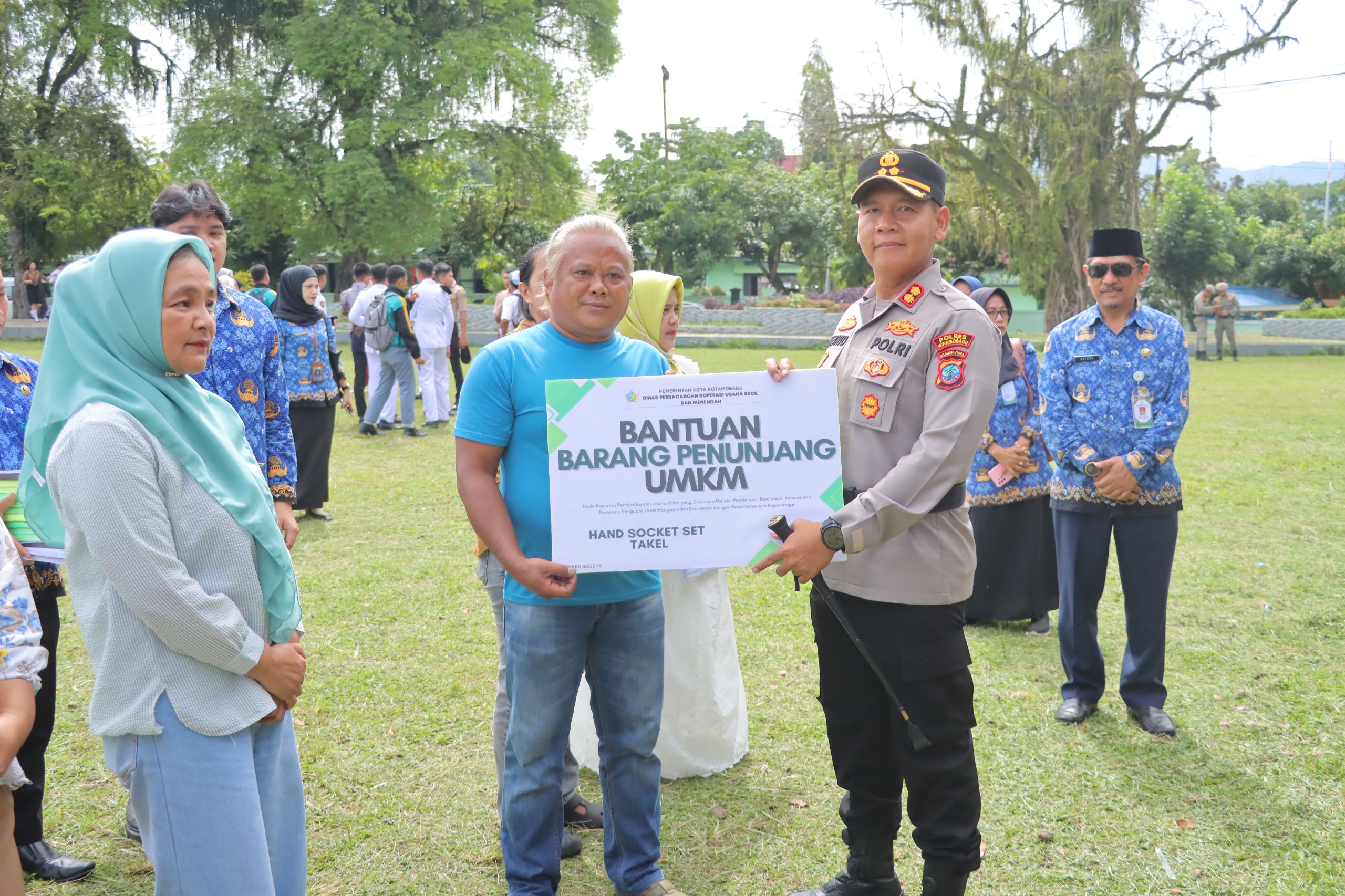 NPM, Kotamobagu – Kapolres Kotamobagu AKBP Irwanto SIK MH, menyerahkan secara langsung bantuan barang penunjang Usaha Mikro Kecil dan Menengah (UMKM) dari Pemerintah Kotamobagu untuk para pelaku usaha pada peringatan Hari Sumpah Pemuda ke- 97 di alun – alun Boki Hotinimbang Kotamobagu, Selasa (28/10/2025).
