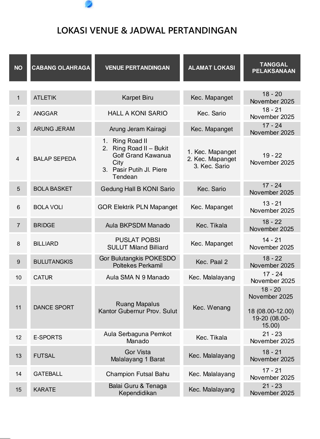 Pun Venue dan jadwal pertandingan sudah dipersiapkan oleh panitia yang didalamnya berkolaborasi antara Pemerintah Provinsi (Pemprov) khususnya Dinas Pemuda dan Olahraga serta Dinas Pemuda Olahraga Kota Manado.