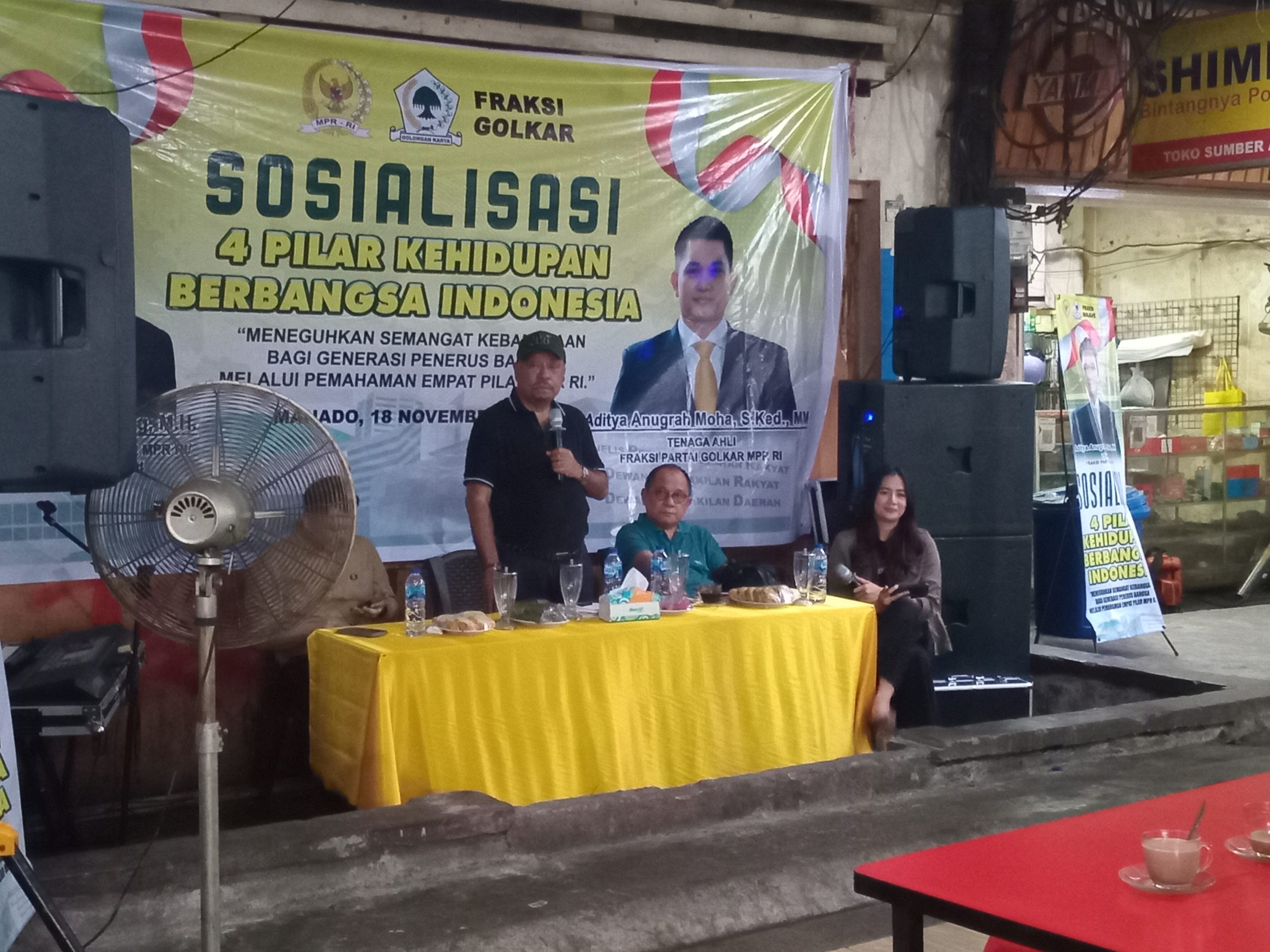 NPM, Manado – Ketua Fraksi Partai Golkar MPR RI Melchias Markus Mekeng menggelar sosialisasi empat pilar kebangsaan, di Jalan Roda, Selasa 18 November 2025.
