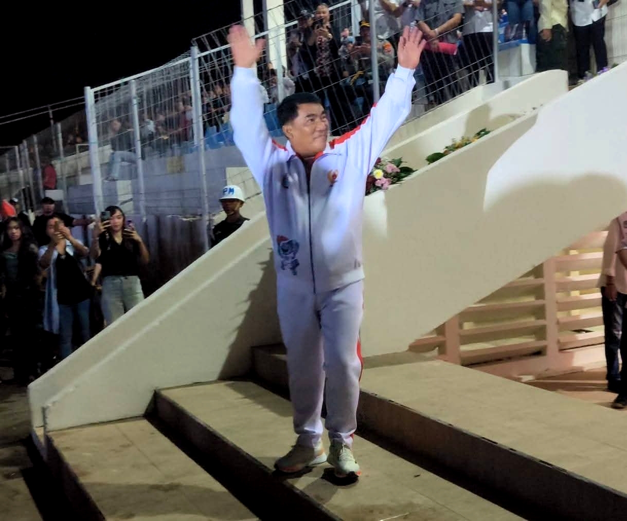 Gubernur Yulius Selvanus Komaling melambaikan tangan kepada penonton di pembukaan Porprov XII Sulut. (ist)