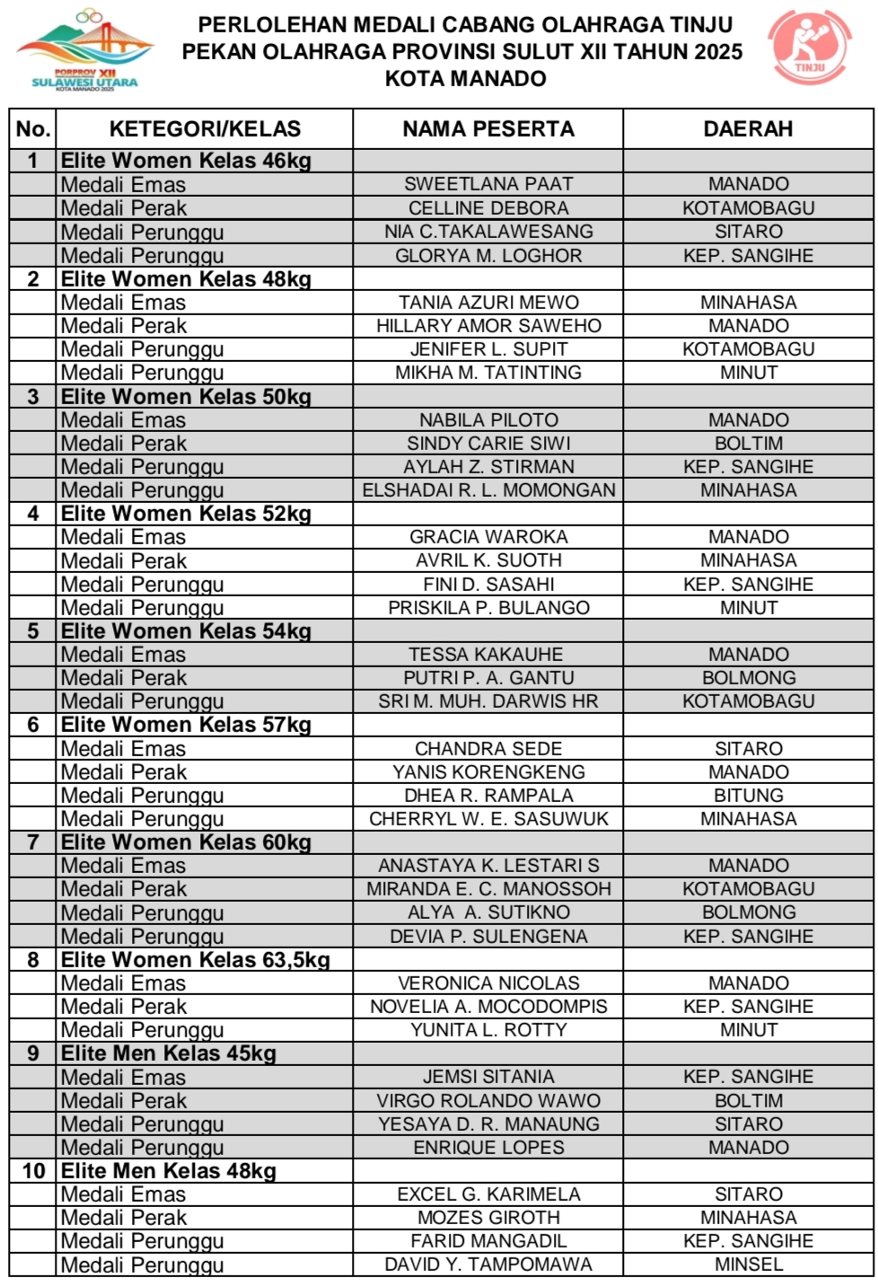 NPM, Manado – Kontingen Kota Manado memastikan diri sebagai juara umum Pekam Olahraga Provinsi (Porprov) XII Sulut menyusul cabang olahraga (Cabor) tinju menguasai perolehan medali emas.