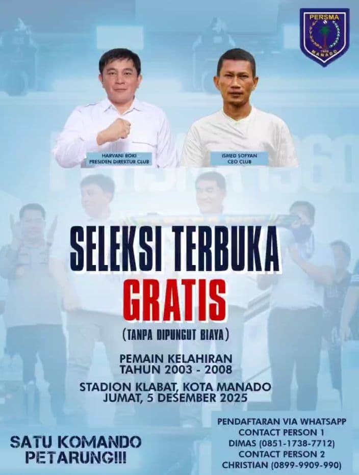 Klub sepak bola Persma 1960 membuka seleksi terbuka yang rencananya digelar pada Jumat, 5 Desember 2025 mendatang di Stadion Klabat, Manado.
