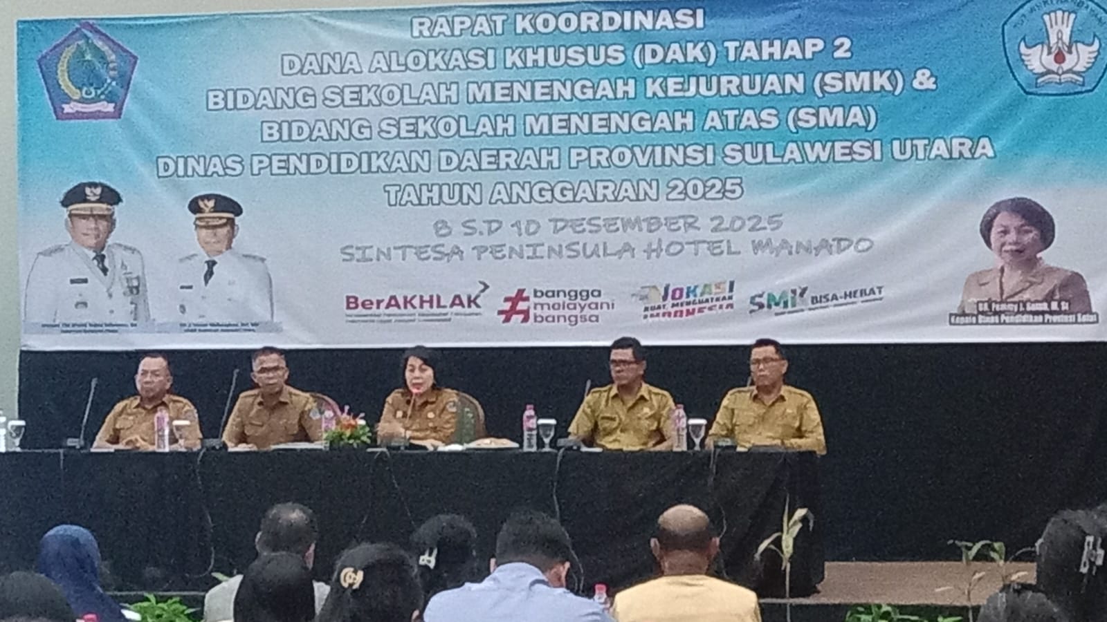NPM, MANADO – Dinas Pendidikan Daerah (Dikda) Provinsi Sulawesi Utara (Sulut) melaksanakan Rapat Koordinasi (Rakor) Dana Alokasi Khusus (DAK) tahap 2 Bidang SMK dan SMA Tahun Anggaran (TA) 2025.