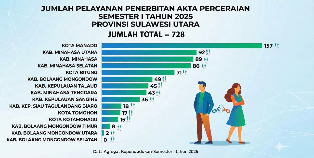 NPM, Manado – Disdukcapil-KB Provinsi Sulawesi Utara merilis angka perceraian di Sulawesi Utara pada Semester I 2025 mencapai 728 kasus, Jumat.