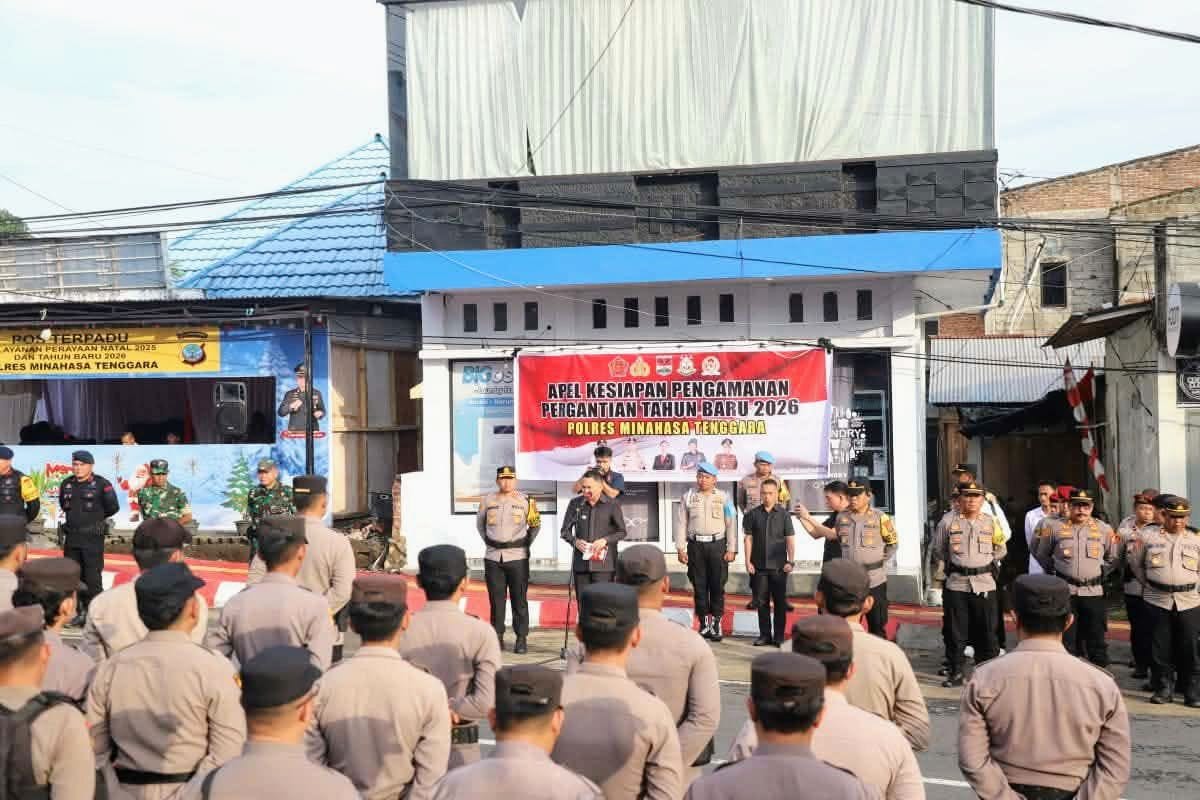 NPM, Mitra – Polres Minahasa Tenggara (Mitra) menggelar Apel Kesiapan Pengamanan Pergantian Tahun Baru 2026 dihadiri Bupati Ronald Kandoli, Rabu (31/12/2025).