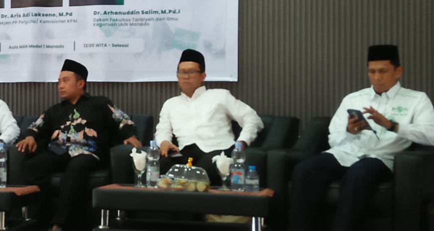 Halaqah peran guru Aswaja dalam konteks moderasi beragama dan pendidikan multikultural di aula MAN Model. Tampak ketiga pemateri saat kegiatan berlangsung. Foto istimewa