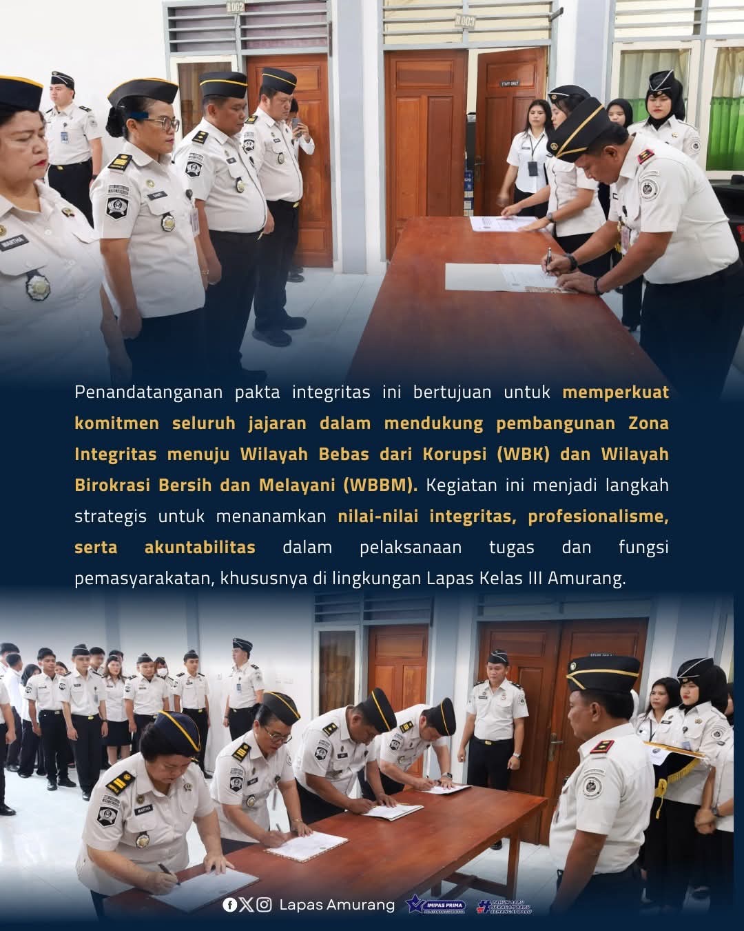 Menurut Kalapas Kelas III Amurang Yansen A.Md.IP SH, penandatanganan pakta integritas ini bertujuan untuk memperkuat komitmen seluruh jajaran dalam mendukung pembangunan Zona Integritas menuju Wilayah Bebas dari Korupsi (WBK) dan Wilayah Birokrasi Bersih dan Melayani (WBBM).