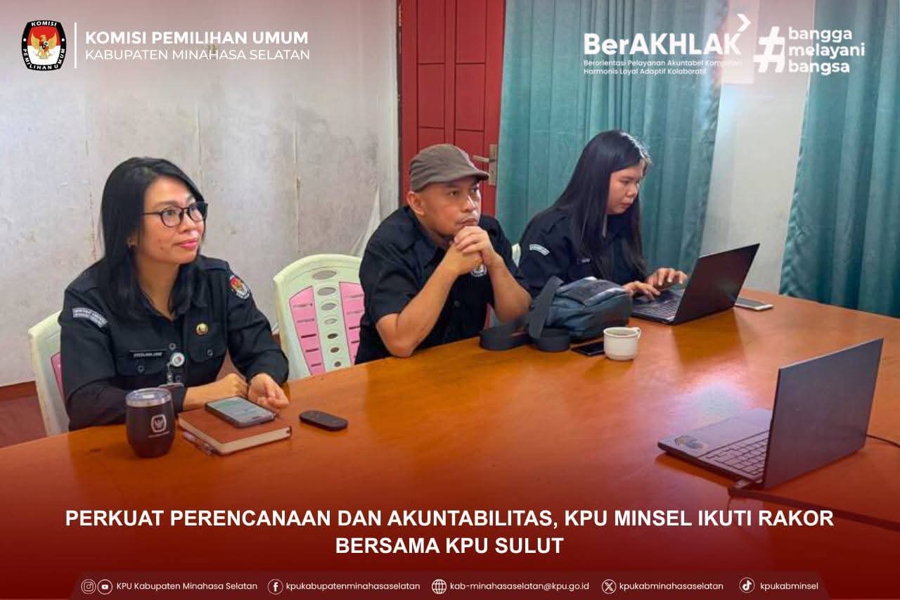 NPM, Amurang – Komisi Pemilihan Umum (KPU) Kabupaten Minahasa Selatan terus berkomitmen meningkatkan kualitas perencanaan dan akuntabilitas kinerja lembaga. Komitmen tersebut diwujudkan melalui keikutsertaan dalam Rapat Koordinasi (Rakor) yang diselenggarakan oleh KPU Provinsi Sulawesi Utara, Rabu (11/02/2026).
