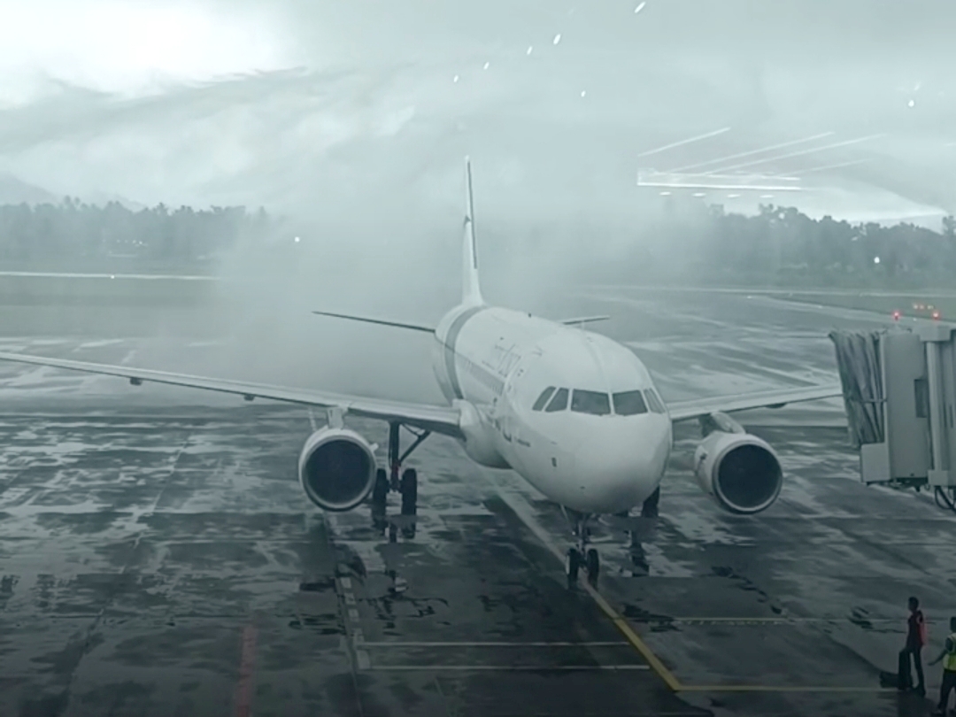 Pesawat dari maskapai TransNusa mendapat penyambutan air saat mendarat perdana di Bandara Internasional Sam Ratulangi, Manado, Sabtu (14/02/2026). (ist)