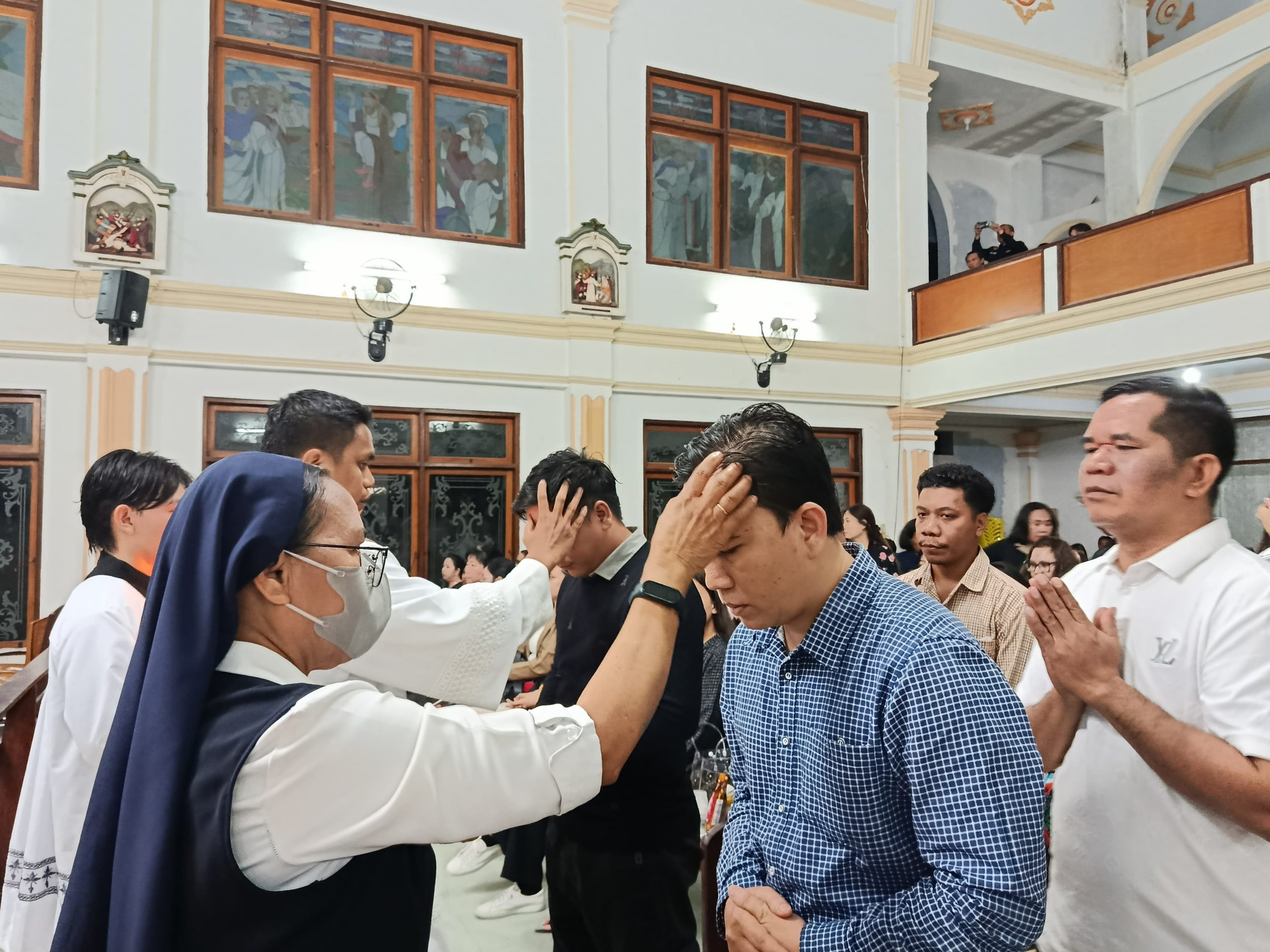 Setelah liturgi sabda, umat menerima abu yang ditandai di dahi sebagai simbol kefanaan dan pertobatan.