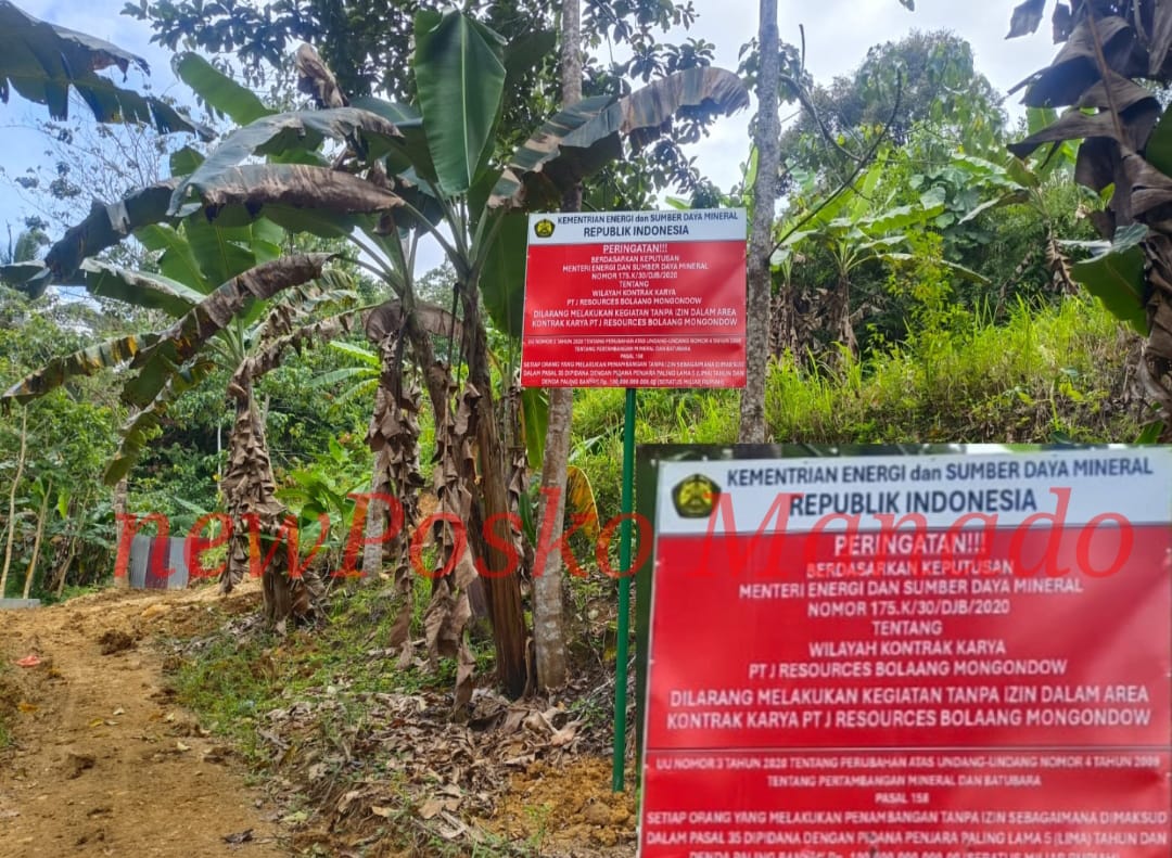 NPM, BOLMONG– PT J Resources Bolaang Mongondow (PT JRBM) akhirnya mengambil langkah tegas dan memasang papan peringatan di jalan masuk aktifitas Pertambangan Emas Tanpa Ijin (PETI) Gunung Tagin.