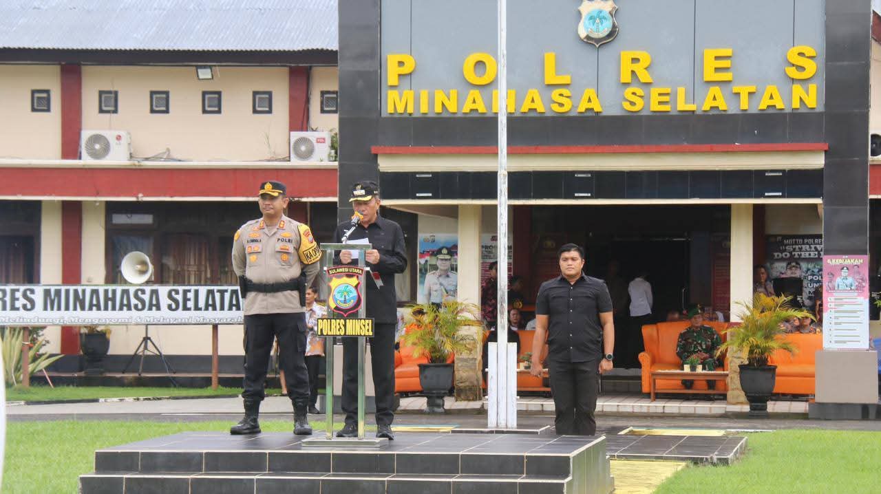 NPM, Amurang – Bupati Minahasa Selatan Franky Donny Wongkar, S.H., bersama Kapolres Minahasa Selatan AKBP David Candra Babega, S.I.K., M.H., memimpin Apel Gelar Pasukan Operasi Kepolisian Terpusat Ketupat Samrat 2026 di Lapangan Upacara Polres Minahasa Selatan, Kamis (12/3/2026). Apel tersebut digelar untuk memastikan kesiapan aparat dalam mengamankan perayaan Hari Raya Idulfitri 1447 Hijriah.