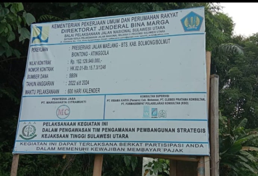 NPM, Manado – Inakor Sulawesi Utara menyoroti pelaksanaan proyek preservasi jalan nasional pada ruas Maelang – Bts. Bolmong/Bolmut – Biontong – Atinggola (akses Terminal Boroko), setelah muncul dua nilai anggaran berbeda dalam kurun waktu yang relatif berdekatan.