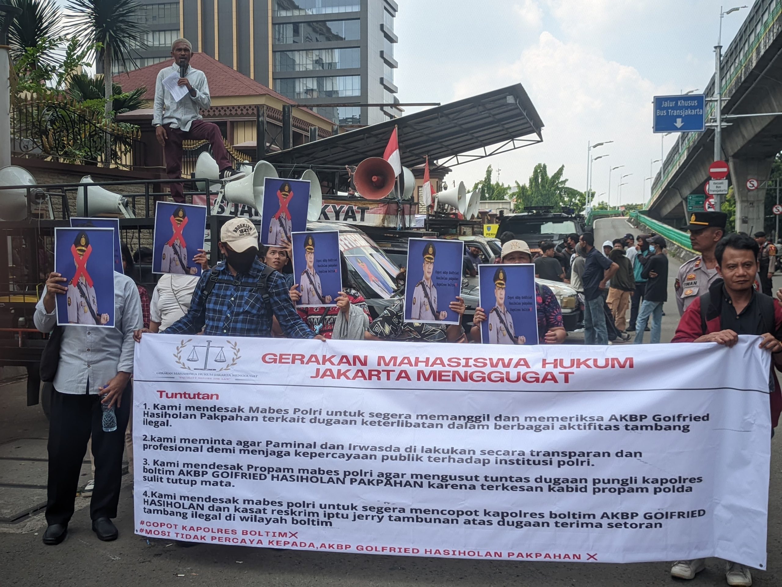 NPM, Jakarta – Kapolres Bolaang mongondouw Timur (Boltim) di demo oleh pihak yang menamakan diri Gerakan Mahasiswa Hukum Jakarta Menggugat di Mabes Polri, Senin.