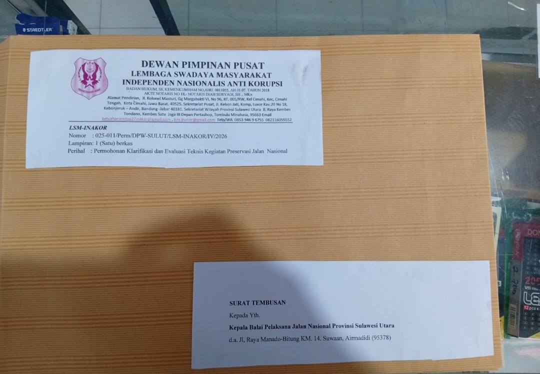 NPM,MANADO – LSM Inakor Provinsi Sulawesi Utara secara resmi menyampaikan surat permohonan klarifikasi kepada Direktorat Jenderal Bina Marga, serta ditembuskan kepada Balai Pelaksanaan Jalan Nasional (BPJN) Sulawesi Utara dan Satuan Kerja terkait, menyangkut kegiatan preservasi jalan nasional pada ruas Maelang – Bts. Bolmong/Bolmut – Biontong – Atinggola (akses Terminal Boroko).